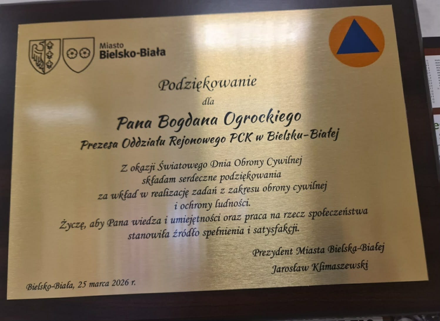 Osobom zaangażowanym w działania związane z różnymi kryzysowymi sytuacjami (np. skutki pandemii COVID‑19, kryzys uchodźczy wywołany rosyjską agresją na Ukrainie, powodzie błyskawiczne, wręczono pamiątkowe ryngrafy. Wśród wielu wyróżnionych znalazł się również Bogdan Ogrocki – Komendant Straży Miejskiej w Czechowicach-Dziedzicach, który z rąk Prezydenta Bielska-Białej odebrał pamiątkowy ryngraf w imieniu Oddziału Rejonowego PCK w Bielsku-Białej, którego jest Prezesem.